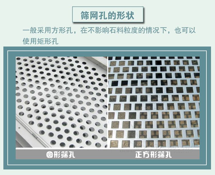 篩網(wǎng)一般采用方形孔,小網(wǎng)眼是用來防止堵塞孔網(wǎng)的,如果孔塞嚴(yán)重,在不影響石料粒度的情況下,也可以使用矩形孔。但是,從使用周期的角度來看,必須注意網(wǎng)眼的方向,否則會(huì)影響篩網(wǎng)的使用周期。