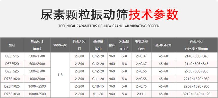 尿素顆粒振動(dòng)篩有:DZSF-515、DZSF-520、DZSF-1020、DZSF-1025、DZSF-1030、DZSF-1035、DZSF-1540等長(zhǎng)、寬、高不同的機(jī)型。
