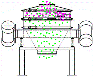 (2-2)直排篩工作原理:該系列篩機(jī)是利用兩側(cè)臥式振動電機(jī)為激振源,振動電機(jī)置于機(jī)體一側(cè),物料進(jìn)入設(shè)備內(nèi)部后,受振動源作用力在篩面上做橢圓運(yùn)動軌跡.快速并往復(fù)完成過網(wǎng)動作的同時(shí),振動力能往并連續(xù)的對物料產(chǎn)生剝離、打散及重組的作用,從而使物料快速過網(wǎng),不能過網(wǎng)物料則按設(shè)備運(yùn)動軌跡由篩上排料口排出,完成篩分作業(yè)過程;