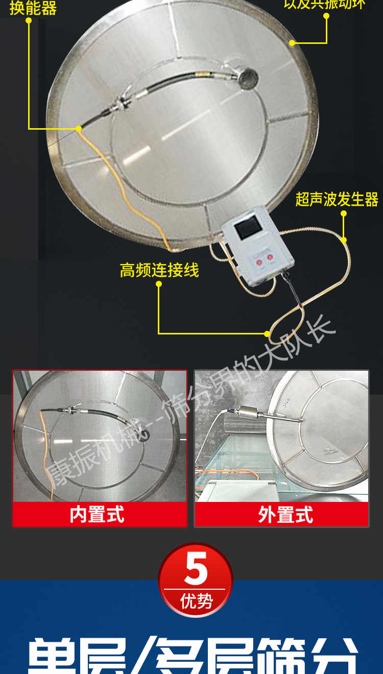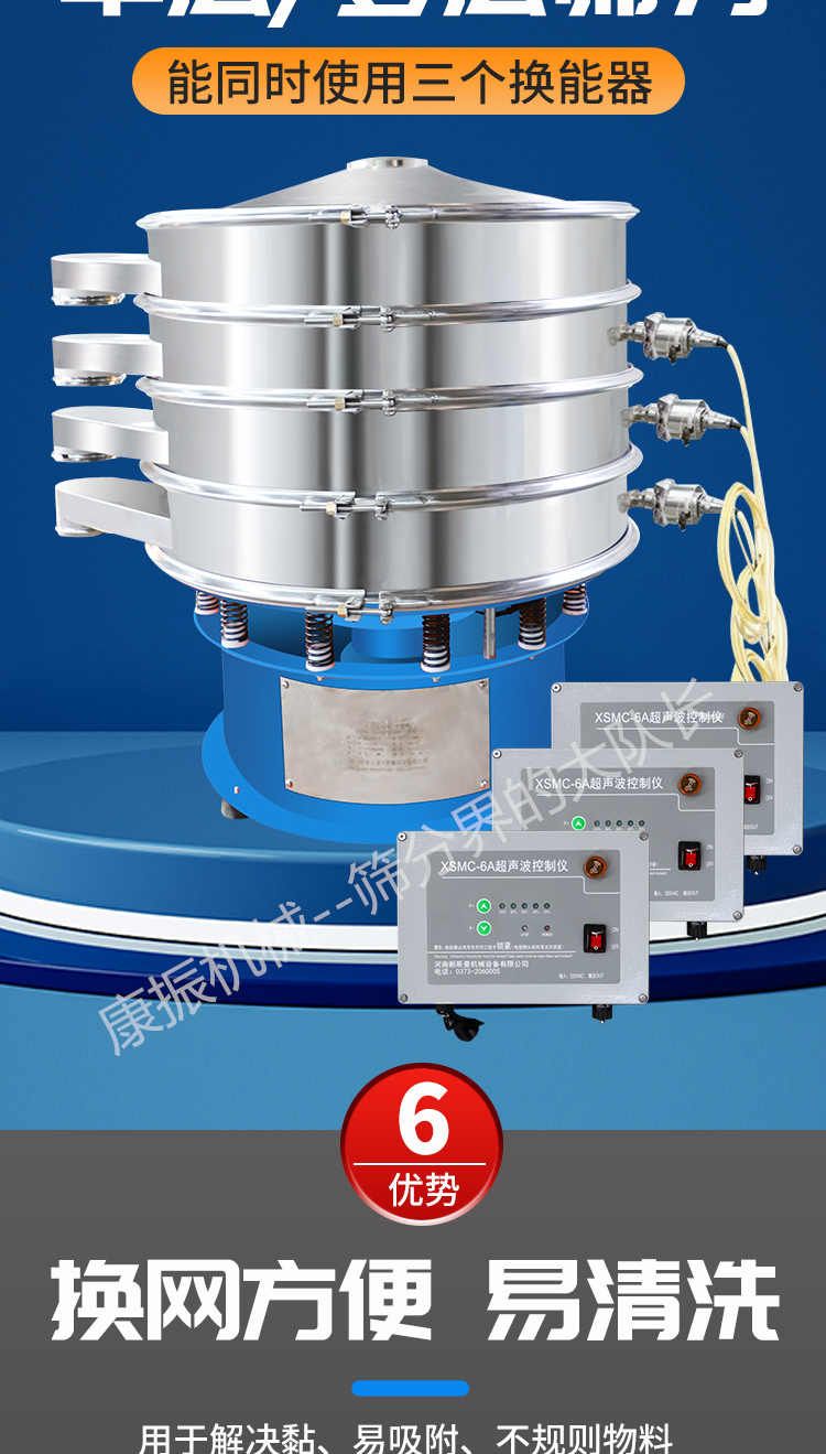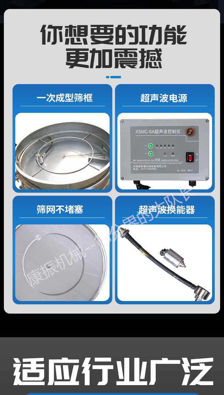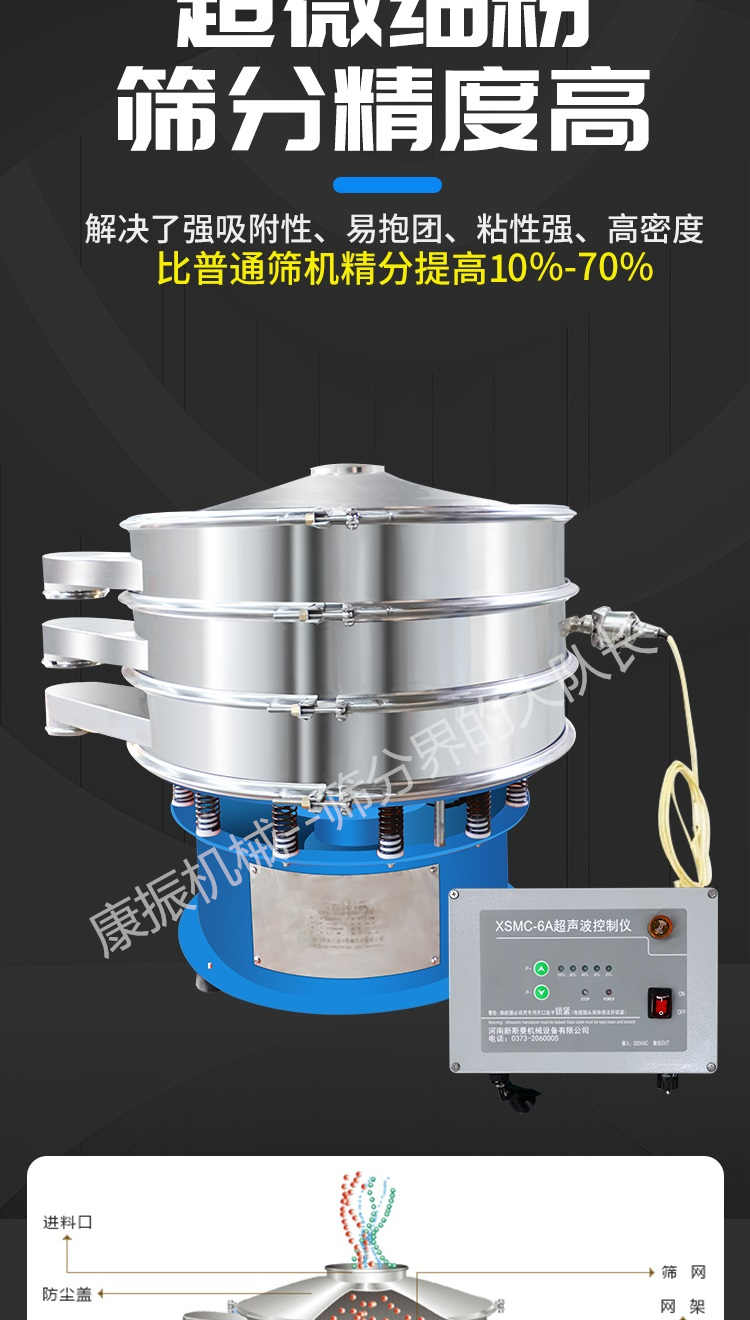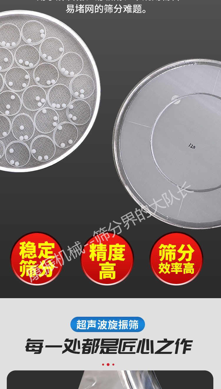 超聲波振動(dòng)篩是在旋振篩的基礎(chǔ)上引入了超聲波清網(wǎng)裝置,通過將220V、50Hz或110V、60Hz電能轉(zhuǎn)化為18KHz的高頻電能,輸入超聲換能器,將其變成18KHz機(jī)械振動(dòng),從而達(dá)到高篩分和迅速清網(wǎng)的目的,使超微細(xì)粉篩分成為易事。該系統(tǒng)在傳統(tǒng)的振動(dòng)篩基礎(chǔ)上在篩網(wǎng)上引入一個(gè)低振幅、高頻率的超聲振動(dòng)波(機(jī)械波),以改善超微細(xì)粉體的篩分性能。特別適合高附加值精細(xì)粉體的用戶使用。超聲波篩分系統(tǒng)是一種簡(jiǎn)單實(shí)用、可靠的篩分系統(tǒng),是當(dāng)前網(wǎng)孔堵塞的有效的解決方法??蓮V泛應(yīng)用于制藥、冶金、化工、選礦、食品等要求精細(xì)篩分過濾的行業(yè),篩分過濾精度高,有效解決因團(tuán)聚、靜電、強(qiáng)吸附性卡堵網(wǎng)孔等篩分難題,是國(guó)內(nèi)篩分行業(yè)的一項(xiàng)重大技術(shù)突破。