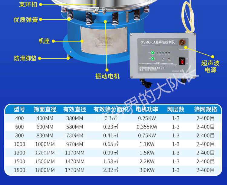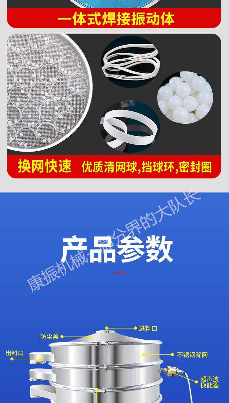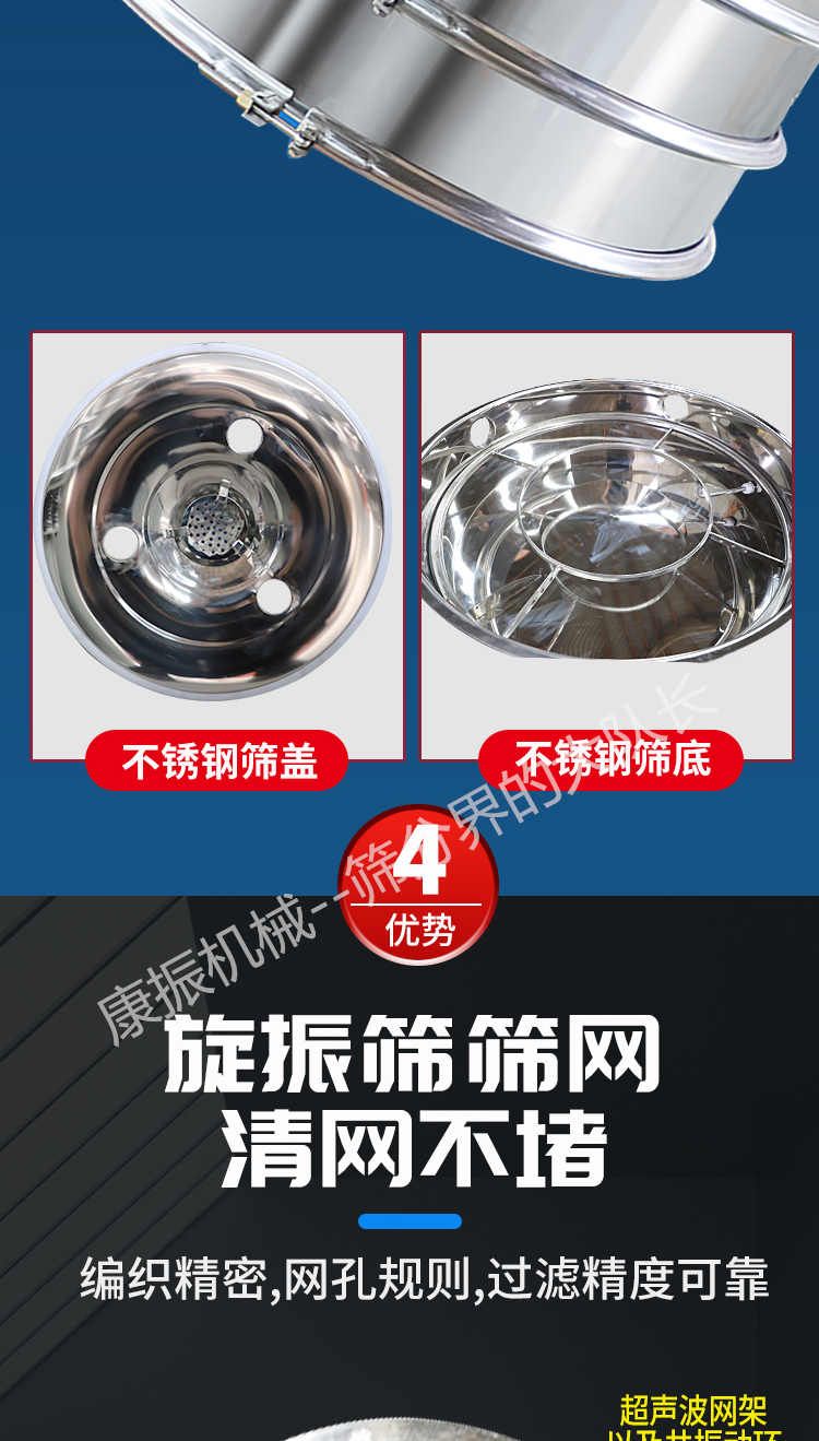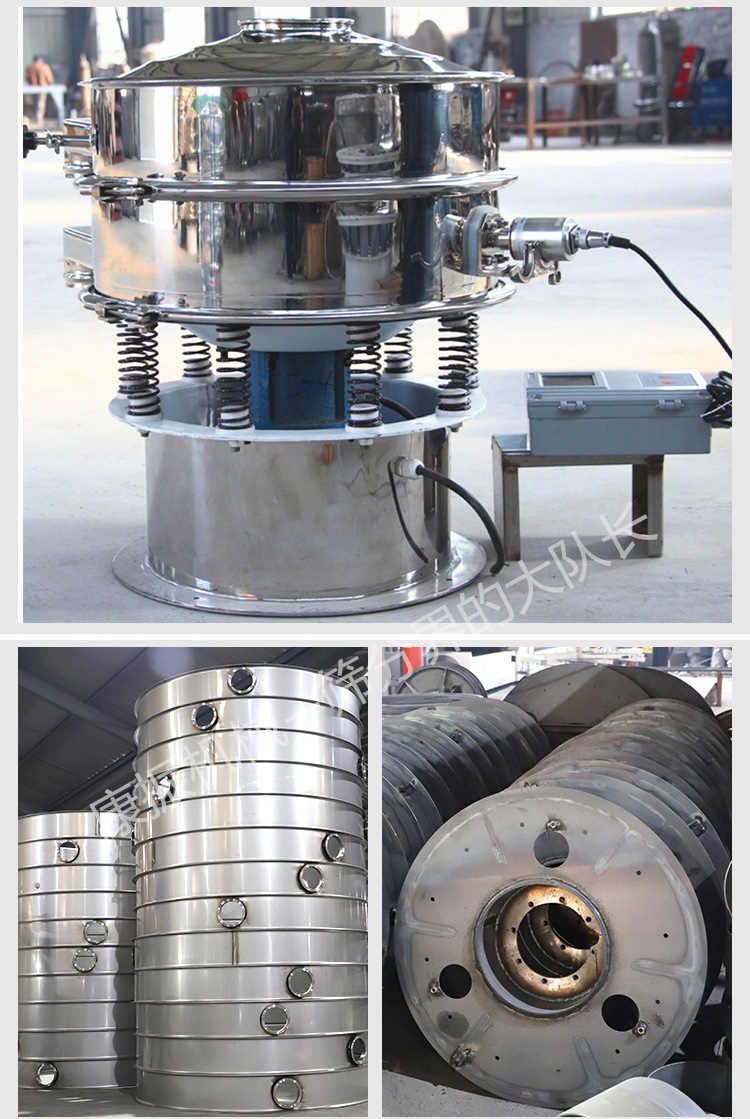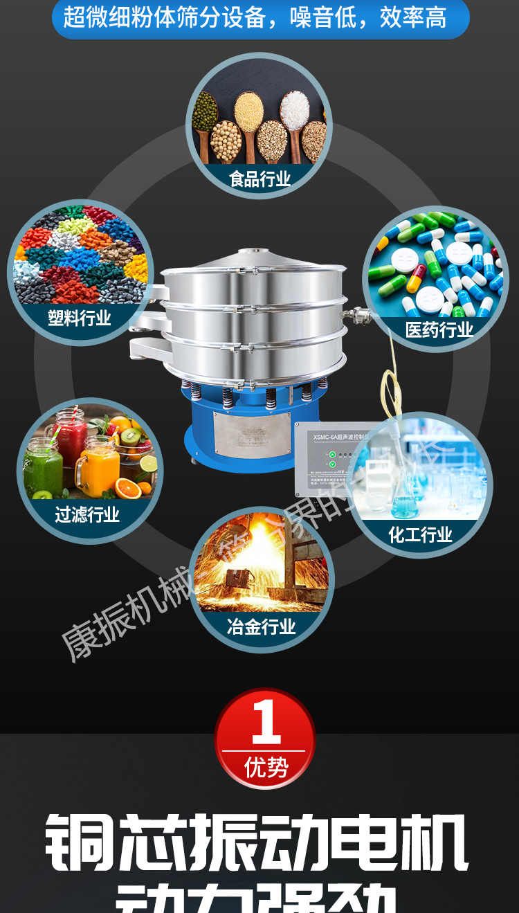 超聲波振動(dòng)篩是在旋振篩的基礎(chǔ)上引入了超聲波清網(wǎng)裝置,通過將220V、50Hz或110V、60Hz電能轉(zhuǎn)化為18KHz的高頻電能,輸入超聲換能器,將其變成18KHz機(jī)械振動(dòng),從而達(dá)到高篩分和迅速清網(wǎng)的目的,使超微細(xì)粉篩分成為易事。該系統(tǒng)在傳統(tǒng)的振動(dòng)篩基礎(chǔ)上在篩網(wǎng)上引入一個(gè)低振幅、高頻率的超聲振動(dòng)波(機(jī)械波),以改善超微細(xì)粉體的篩分性能。特別適合高附加值精細(xì)粉體的用戶使用。超聲波篩分系統(tǒng)是一種簡(jiǎn)單實(shí)用、可靠的篩分系統(tǒng),是當(dāng)前網(wǎng)孔堵塞的有效的解決方法??蓮V泛應(yīng)用于制藥、冶金、化工、選礦、食品等要求精細(xì)篩分過濾的行業(yè),篩分過濾精度高,有效解決因團(tuán)聚、靜電、強(qiáng)吸附性卡堵網(wǎng)孔等篩分難題,是國(guó)內(nèi)篩分行業(yè)的一項(xiàng)重大技術(shù)突破。