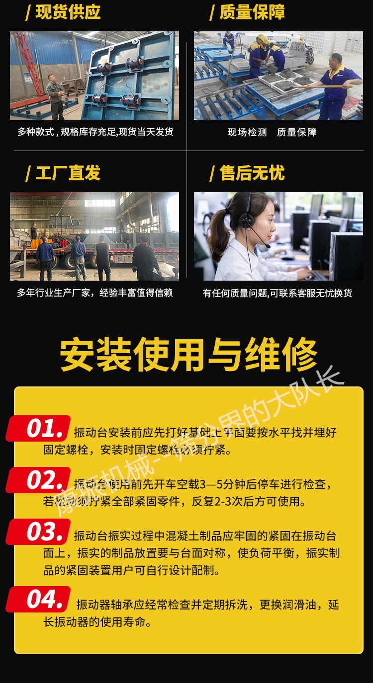 3、 振動(dòng)臺(tái)在振實(shí)過程中,混凝土制品應(yīng)牢固的緊固在振動(dòng)臺(tái)面上,所需振實(shí)的制品放置要與臺(tái)面對(duì)稱,使負(fù)荷平衡,振實(shí)制品的緊固裝置。用戶可根據(jù)自己的需求自行設(shè)計(jì)配制。
