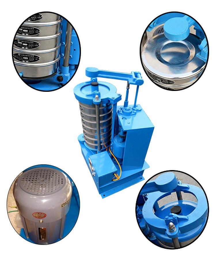 電機帶動齒輪通過同步帶傳動到主軸上,經齒輪變速后主軸按要求的轉速轉動,主軸帶動偏心輪使滑板做往復運動,帶動安裝在滑板托盤中的試驗篩左右搖動,同時主軸帶動頂桿齒輪轉動,變速后頂桿齒輪通過凸輪頂擊頂桿,頂桿使拍錘上下拍擊試驗篩上蓋,使得試驗篩、分樣篩中的物料往復和上下振動,使小于試驗篩的篩面網孔的物料顆粒篩分進下層試驗篩,如此層層篩選,使每層試驗篩內只留相同粒度的物料。達到不同粒度的分離并確定此物料的粒度組成。